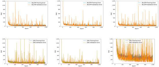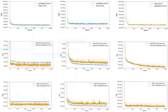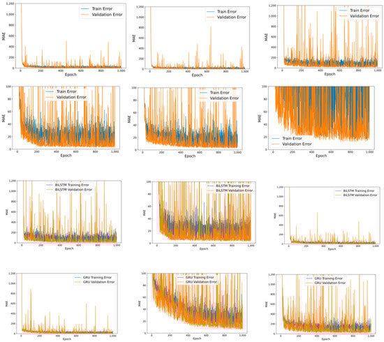 RNN-based models’ training MAE result for experiments 1 and 2: rows 1–3 and column 1 display the MAE-LSTM, BiLSTM, and GRU with training dataset and target dataset . Figures in rows 1–3 and columns 2–3 show MAE-LSTM, BiLSTM, and GRU with training dataset , , and target dataset , respectively. Figures in rows 4–6 columns 1–3 was trained with , and their target set was , respectively.
