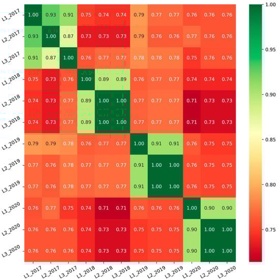 The MAE of the individual local models in Section 4.2 results shows that in experiments 1–3. This relation corresponds to non-IID degree: . Furthermore, Figure 5 shows the heatmap that displays the Pearson correlation of the yearly period dataset. , , and , where denotes the Pearson Correlation Coefficient of input and , . This implies that the unmatched period encompasses a relatively low statistical feature than the equivalent year dataset, which is likely to be a non-IID dataset in terms of the period (i.e., dates rotate with the years).