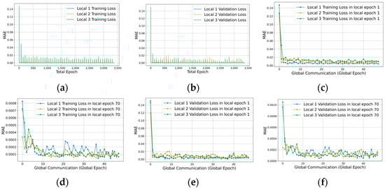 Based on the locally trained models with a monthly dataset with 70 epochs, it merges them to create and iteratively propagates the (i.e., 12 months, 4 years), where the overall training epoch is . The result is shown in Figure 5, where the loss values are trained from , , and ; training and validation datasets are shown in Figure 6a,b. At every global epoch, a surge in loss is observed. Although , which satisfies the objective function, . Figure 6c–f shows the loss of initial and final local epoch , and results show that tend to converge. Note that the LSTM layer was used in local models.