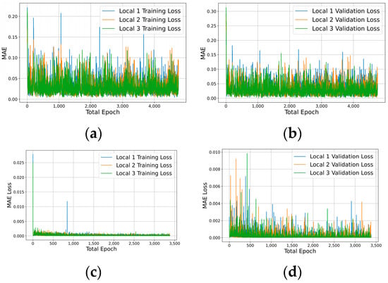 All the cases have identical total epochs () and equivalent layer structures using LSTM and hyperparameters to former experiments in this Section 4. Case results are shown in Figure 7a,b, with unstable convergence and relatively high loss values. Case was already conducted and delivered in Figure 6a,b, and case results are displayed in Figure 7c,d. In general, case had the best performance, with a much smaller loss (i.e., when observing the scale of the suggested Figure 7a–d and stable trajectory compared to other cases). This implies that more local database volume will incorporate better convergence when training FL.