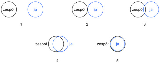 To find out how much integration into the team the participants felt, we asked the participants to “Circle one of the five graphics that best illustrates your sense of belonging to the group you were a member of during the study.” The graphics are shown in Figure 2 below: ‘ja’ is ‘I’ and’ zespół’ is ‘group’.