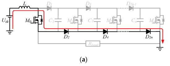 BMPG works in inductor charging mode, as shown in Figure 3a. The switch M0 in the circuit is turned on, and switches M1~Mn are turned off. The duration of this mode is DT. The DC power supply Udc charges the inductor L through M0, D2, D4 … D2n. At this time, the inductor voltage is equal to the input DC power supply voltage, and the charging current can be expressed by Equation (1):