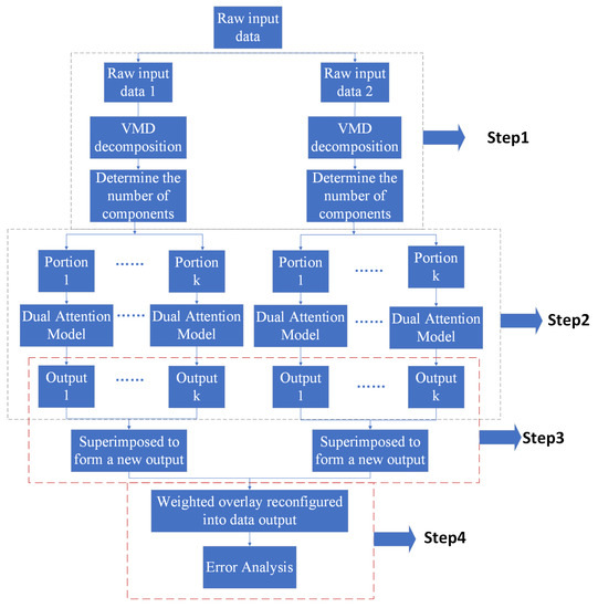 Figure 2 presents a comprehensive schematic of the dual attention model implementation, which comprises three primary components: the CNN layer, the GRU layer, and the attention layer. The components derived from the enhanced VMD algorithm are normalized using MinMaxScaler to confine the overall value range between 0 and 1 and subsequently fed into the CNN layer. During data input, the individual features of the input are weighted using the feature attention mechanism, thereby reinforcing the features that exert a significant impact on the outcome. On the output side, the temporal attention mechanism is employed to enhance the model accuracy by capitalizing on the correlation of the data on the time scale.