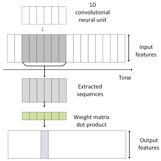 Due to the stability of electricity consumption habits, the power system data possesses apparent repeatability. For example, the curve of regional load data in the same period of two days has substantial similarity, and the photovoltaic generation curve also shows strong similarity in two days with similar climate environments. This similarity provides a reasonable basis for convolutional neural networks. Second, the convolutional neural network can learn patterns’ spatial hierarchy; the first convolutional layer can learn smaller local patterns, and the second convolutional layer further reconstructs the first convolutional layer’s patterns to form larger patterns. This feature can make the convolutional neural network can learn more and more complex and abstract data [26]. Regarding temporal data processing, one-dimension (1D) convolution is commonly utilized. The operational principle of one-dimension convolution is depicted in Figure 3. The 1D convolutional layer is adept at detecting local patterns in a sequence. As the same input transformation is applied to each sequence segment, patterns discovered at one position in the temporal data can be subsequently recognized at other positions, rendering the 1D convolutional neural network translation invariant (concerning time translations).