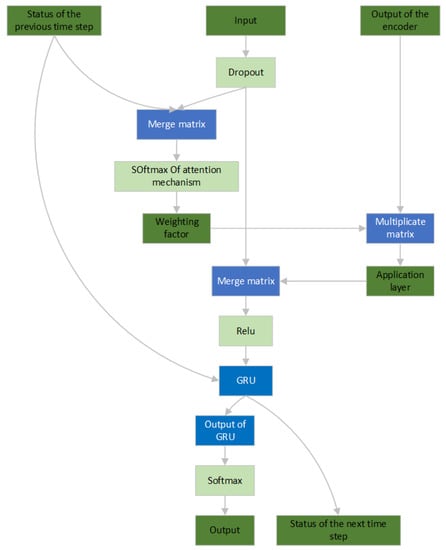 The core idea is to make the context vector , which is otherwise invariant in the seq2seq structure, dynamic by reorganizing it several times. The traditional context vector selects the output of the last time step as the final output because the data can be regarded as the process of gradually extracting features after GRU processing. The output of the last time step often contains important information about the state of the past time steps. However, for data with long time steps and strong information correlation, this model often leads to the vital information of a past time step being ignored or not highlighting the information strongly associated with the prediction results [31]. Through the temporal attention mechanism, the vector is dynamized, and is no longer just the output of the last time step but also a dynamic combination of individual time steps. Different weight coefficients are given for different predicted contents, thus giving different , which finally achieves the role of extracting necessary information in the time series.