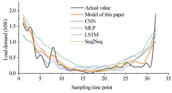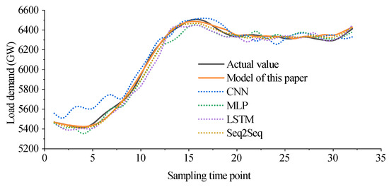 Table 1 presents a summary of the Mean Squared Error (MSE) and Mean Absolute Error (MAE) for various models with a reconstructed data length of 32. The experimental results from three data sets, namely, the load data set, wind power generation data set, and photovoltaic power generation data set, are arranged from left to right. As the summary table employs normalized data results, it does not include any units. Figure 5, Figure 6 and Figure 7 depict the schematic diagram of the load data reconstruction results, wind power generation data reconstruction results, and photovoltaic power generation data reconstruction results, respectively, with a reconstructed data length of 32 sampling time points. To facilitate comparison and highlight the characteristics of model reconstruction, a period with more salient features was selected from each of the three datasets.