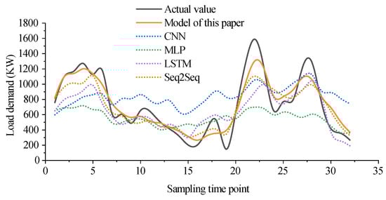 By comparing the load with 32 sampling time points and 128 sampling time points, it is evident that the prediction model in this paper has a better fit to the true value, and the accuracy decreases more slowly as the data length increases. Compared with other models, the model proposed in this paper not only reconstructs the trend of the missing data more accurately but also performs better for the part of the load with large fluctuations and can analyze the law of sudden changes to a greater extent, which improves the overall model accuracy. Comparing the wind power generation data and photovoltaic power generation data, which are more random and fluctuating, it is clear that the model proposed in this paper fits the sudden changes in the data significantly better than the other models, and it not only fits the changes in the trend of the data but also captures the drastic local changes more accurately, making the output of this model closer to the actual situation. For example, in the case of photovoltaic power generation data, although the overall trend can be captured more obviously, the overall data have the characteristic of fluctuating sharply up and down around the trend, and the model in this paper can capture the larger fluctuations more accurately, so that the details can be supplemented to make the overall error smaller.