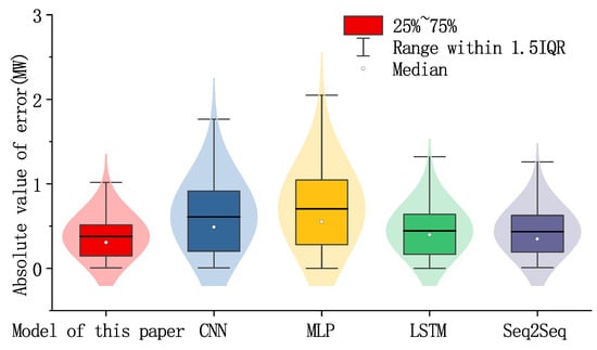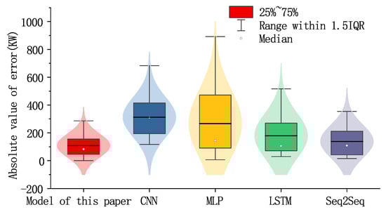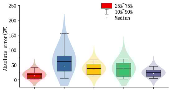 Figure 8 and Appendix A Figure A4 display the error plots of load data reconstruction results for 32 and 128 sampling points, respectively. The analysis of the load data reveals that the reconstruction error of 128 sampling points for all models is significantly larger than the error of 32 sampling points. For the proposed model, most of the errors increase from the 0–50 GW interval to the 0–115 GW interval. However, compared to other models, the error distribution of the proposed model is still relatively concentrated, which is consistent with the conclusion that the MAE and MSE are relatively smaller in the previous analysis. The performance of the proposed model is more outstanding in the error distribution interval 10–90%, error distribution interval 25–75%, and median error distribution, especially the 25–75% error distribution index, which is lower than other models. This indicates that most of the errors of the proposed model are concentrated around 0. Compared to other models, the main reason for the superior performance of the CNN model in the 32 sampling case is related to its working principle. CNN itself does not have the concept of time flow and uses the form of convolutional kernel to identify data features. Even if the recognition window is increased, as long as the features identified by the CNN convolutional kernel can still be applied, the error distribution of the CNN model does not change much.