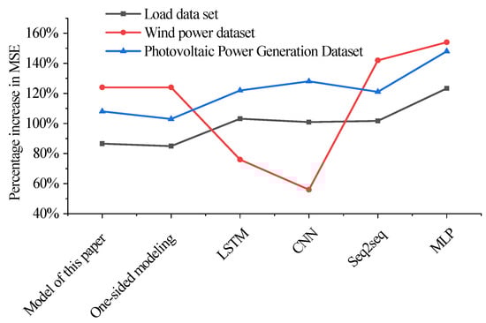 Figure 11 illustrates the percentage of MAE increase for 128 sample points compared to 32 sample points. Figure 12 illustrates the percentage increase of MSE for 128 samples compared to 32 samples. From Figure 11, it is evident that the MAE of each model increased significantly for 128 samples compared with 32 samples, and the most significant increase was 150% for LSTM and CNN. Furthermore, by comparing the three data sets, the MAE of this model is the smallest in most cases, indicating that this model makes the best use of the data. Similarly, it can be observed from Figure 12 that the performance of this model is superior in the other two datasets, except for the wind power dataset. The possible reasons for the low MSE of CNN and LSTM models in wind power data are: (1) The MSE of these two models is already relatively large in the province at 32 sampling points, which means that the model itself does not utilize the data to a high degree. (2) The regularity of the wind power data set itself is more difficult to find, which leads to the model itself not resolving the data set well, resulting in the reconstruction length. When the length of the reconstruction increases, there is a more obvious decrease in the degree of utilization.