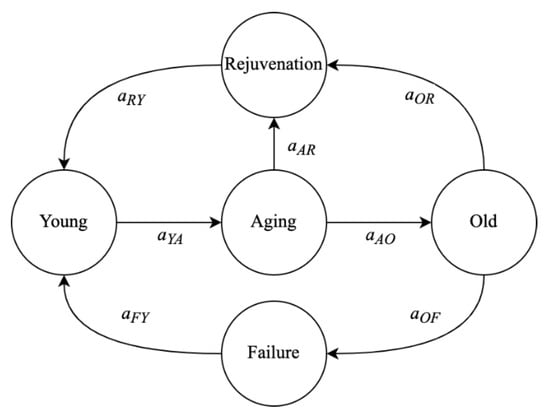 It is proposed to extend the aging model [,] with early rejuvenation so that the rejuvenation procedure is not performed in the young state of the system. In this case, the general model of aging and rejuvenation with different levels of aging can be represented by a set of the five possible states of the system: “Young”, “Aging”, “Old”, and “Rejuvenation”, and “Failure”. The “Young”, “Aging,” and “Old” states reflect the gradual deterioration of system performance in the context of aging software. Thus, the general extended model can be represented as a graph (Figure 2), where its states have the following characteristics:
