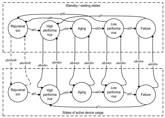 Combining the model of aging and rejuvenation, which considers different levels of aging, with the model of mobile device activity, the user can obtain an improved Android software aging model [], which is presented as a graph of states and transitions in Figure 3. Possible states of the model system, which considers the different levels of aging and user activity, are as follows: