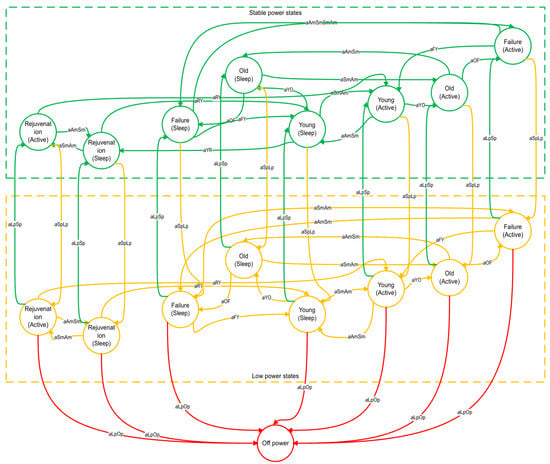 Graph of states and transitions of the aging and rejuvenation model, which considers different levels of aging and user activity of the mobile device [].