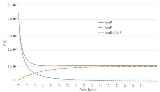 The model’s simulation results without considering the battery charge (Figure 5) show that the optimal rejuvenation time can be estimated to be 1/aYR = 840 min (14 h). The lowest point of the curve AmR + AmF on the graph indicates that at the rejuvenation intensity aYR = 0.00119 min−1, the lowest probability of interrupting the active use of the system by rejuvenation or aging failure can be ensured.