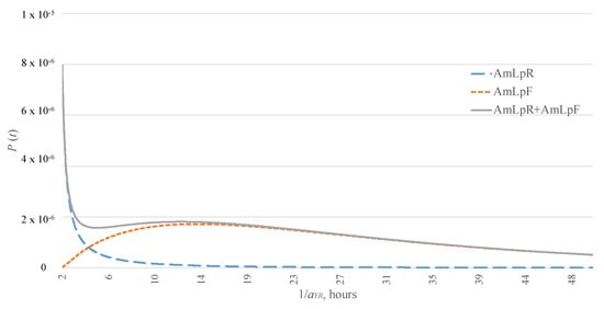 The model considering the battery charge (Figure 6) for the same aging conditions and mobile device activity shows an optimal rejuvenation time of about 240 min (4 h), which is 3.5 times less than the time estimated without considering the battery charge. Using the lowest point of the curve, AmLpR + AmLpF, the rejuvenation intensity can be determined: aYR = 0.00417 min−1. A comparison of the obtained results shows that considering the battery charge has a significant impact on planning the time of software rejuvenation. Thus, if one schedules the software rejuvenation procedure without considering the battery state, the estimated starting time of this procedure will be significantly longer. However, during this time, the device’s battery will most likely enter a low charge state, and performing the rejuvenation procedure will further discharge it, which will have a negative impact on the user experience.