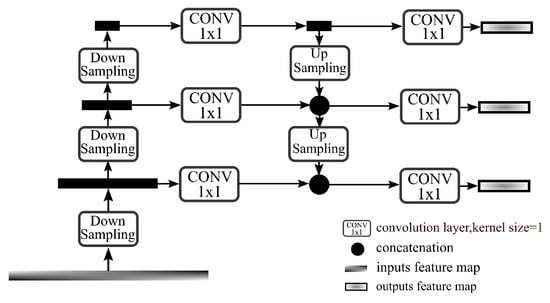 Object detection was made easier with the use of multi-scale fusion [,,,,]. Images of various sizes were created by scaling the source image. Following that, feature maps of various sizes were created based on images of those sizes. Scale-by-scale processing and feature splicing were the last steps in processing the feature map. Features fusion forces feature maps to consider both high-level semantics and shallow details. At the same time, there was no tradeoff made in terms of expression capacity, speed, or resource usage. Feature Pyramid Networks (FPN) [] was a common multi-scale fusion model, as seen in Figure 1. By stacking adjacent layer features, FPN improved the ability of feature maps to express multi-scale semantic information. Inner Outside Net (ION) [] separated ROI (Region of Interest) from the feature map of various sizes and detected objects after fusing features from multiple scales. Any size image could be processed using Spatial Pyramid Pooling (SPP) [], which used spatial pyramid pooling to fuse multi-scale information and enhance object detection performance. In order to improve the ability to extract features, the Atrus Spatial Pyramid Pooling (ASPP) [] used in the DeepLabV3 algorithm swapped out the three spatial pooling layers in the SPP for three dilated convolutions with different expansion rates. By overcoming the conflict between picture resolution and receptive field, ASPP enhanced object detection performance.