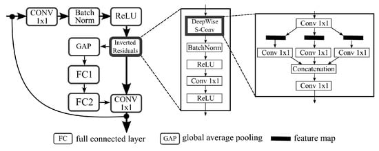 The main principle of deepwise separable convolution was to divide the conventional convolution operation into depthwise and pointwise convolutions. Deep separable convolution had fewer parameters and lower operating costs than traditional convolution. It also significantly reduced the number of network structure blocks and improves the effect of feature extraction. The Inverted Residuals (IR, as depicted in Figure 3, a module of MobilenetV2 [] and the attention mechanism of Squeeze-and-Excitation Networks (SENet) [] channel were combined in MobilenetV3 []. To enhance the quality of the representation produced by the network, SENet explicitly models the correlation between network convolution feature channels. According to the relevance of each feature channel, which was automatically determined through learning, relevant characteristics were then promoted, while features that are not pertinent to the work at hand are suppressed [].