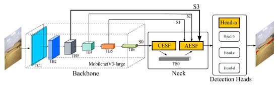 The anchor mechanism and single-level object detection framework YOLOv4 are used as references by the algorithm network. Smaller receptive fields and higher resolution are correlated with shallow features in the deep learning network, which is advantageous for the detection of small objects. The shallow features also include a large number of parameter correlations, which makes the network model relatively complex and slows down inference. We make a trade-off between the proportion of shallow features and the speed of inference to resolve this issue. We take MobileNetV3-Large, a compact and effective backbone network. The decoding module’s task is to decode the characteristics produced by the algorithm network’s detection head and apply Non-Maximum Suppression (NMS) [,,] to the prediction frame. We include a header for recognizing small objects in the decoding module using the YOLOv4 approach as a model.