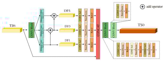 The architecture of the CFM module is shown in Figure 6. For the input feature, the channel is adjusted by convolution blocks, and then the receptive field is expanded by three expansion convolutions with ratios of 1, 3, and 5. For the chessboard effect caused by dilated convolution, we use Hierarchical Feature Fusion (HFF) [] structure to suppress it by hierarchical fusion. The expansion volume is then integrated into features , , and . The 3 × 3 convolution blocks are used to smooth the above features. The feature maps of three levels are stacked by tensor splicing for fusion, and two convolution blocks are used for feature concentration and channel adjustment to finally obtain the semantic fusion feature .