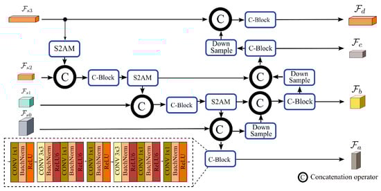 In order to boost semantic feature fusion’s effectiveness, we apply the spatial and channel attention method [] to the scale feature layer, on the basis of a multi-path aggregation network, to enhance the recognition capability of small objects. We specifically deepen the hierarchical structure of scale features by injecting a shallower feature map into the spatial scale fusion module. The effectiveness of the merging of shallow feature maps and high-level semantic maps is simultaneously improved by the employment of the attention mechanism. We proposed the Spatial Scale Attention Module (S2AM) to improve the emphasis on shallow features and the capacity to recognize small objects by adaptively adjusting the weight of space and channels in the process of scale fusion. Figure 7 displays the entire spatial scale fusion module organization.