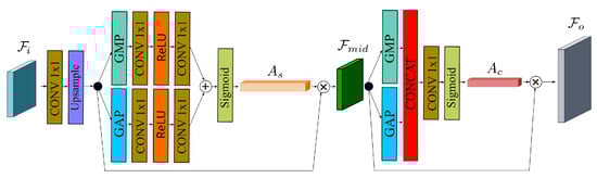 The archiecture of Spatial Scale Attention Module is shown in Figure 8. The adaptive guiding features are aggregated in key directions by the scale attention module in the spatial scale fusion module, which cascades through the attention modules at the two levels of space and channel. The global maximum pooling and the global average pooling are executed, respectively, for the input feature . Two × 1 convolutions are used to tweak the resulting feature layer before sigmoid activation is used to create the channel attention tensor. By aggregating with the feature layer , the output feature layer is created. The two output features are then tensor layered after is pooled globally to large and globally to average along the spatial direction of each layer of channels. The spatial attention tensor is obtained after the stacking features have been modified and turned on by the channel, and the output feature is obtained following the aggregation with . In order to increase the effectiveness of fusion with underlying semantic features, SAM modules have enhanced the features of each scale with spatial attention and channel attention. After attention improvement, the feature picture is sampled using bilinear interpolation and then combined with the top feature.