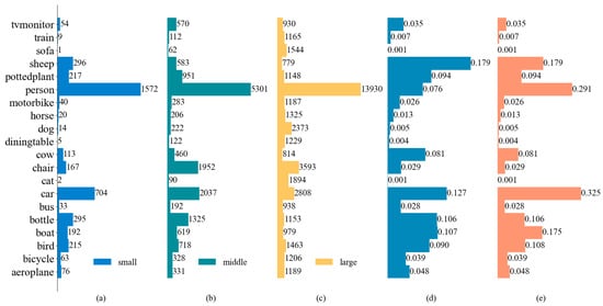 The distribution of the sample labels for VOC07+12. The number of small, medium, and large object labels in VOC datasets for each category are displayed in (a–c). The percentage of small object labels in each category is displayed in (d). The percentage of small object labels in training datasets is displayed in (e).