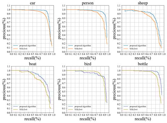 We compare the performance of the proposed algorithm model and the YOLOv4 model in the first six training datasets categories with a significant proportion of small objects (Table 2). The and in the table represent the predicted category accuracy and recall at the threshold of 0.5 confidence. In the aforementioned categories, the detection accuracy of the proposed algorithm has been enhanced. Each category’s average accuracy increased by 4.1%, 4.8%, 3.9%, 5.1%, 1.2%, and 3.7%, respectively. In Figure 11, we visualize the P-R curve of the proposed algorithm on the test sets. The P-R curve depicts the precision and recall value at various confidence levels. The closer the P-R curve is to the upper right corner, the better the performance of the algorithm. The area below the P-R curve represents the average precision of the category ( in Table 2). It can be seen from the figure that the proposed algorithm has better performance in categories with a higher proportion of small objects compared with YOLOv4.