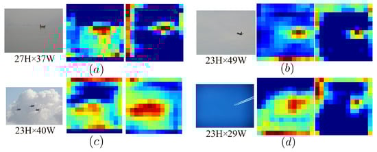 As shown from Figure 13, we can find the characteristics of the CFM module when four different sets of input images are used to verify the effectiveness of CFM module fusion semantics. Each set of images in the figure has three columns. The original input image is in the first column, the feature map produced by the SPP module in the original network in the second column, and the feature TS0 of the sampling CFM module for context semantic fusion in the third column. The findings mentioned above show that the CFM module further improves the object area’s response. It simultaneously increases the distance between the object region and the background and reduces background noise interference. The proposed CFM can increase the efficiency of small object detection when compared to SPP.