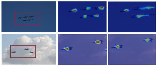 Figure 14 is the visualization of the network output following the addition of CFM and S2AM. Typical small object samples are represented by the first column in the picture, the enhancement algorithm results in the second column, and the original framework results in the third column. The object size in both sample images is 24 × 35 and 23 × 40. As compared to the second line, we find that the proposed module’s identification of dense objects and detection of object stacking have both improved with the addition of CFM and SAM modules. The influence range of the object area in the algorithm (middle figure) in this work has been significantly increased, as can be observed from the third and first lines. The effectiveness of feature extraction has been increased, and small object identification has performed better because of the enhancement module.