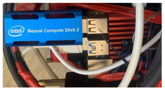 The x86-64 platform hardware environment used in the deployment test is the laptop with Intel I7-8750H Central Processing Unit (CPU) and Nvidia Rtx1050Ti Graphics Processing Unit (GPU). The embedded ARM platform(as shown in Figure 15) employs Raspberry4B which has a 4-cores Cortex-A72 processor and the second generation of Neural Network Stick (NCS2). The NCS2 is an artificial intelligence device that features a high-performance, low-power AI processor. It is specifically designed for deep learning inference and can be used to run neural networks on edge devices such as drones, smartphones, and other compute nodes. The device is capable of running advanced models quickly and efficiently, making it suitable for applications such as image classification, object detection, face recognition, and more. Additionally, it provides an API for easy integration with existing software solutions. We utilize OpenVINO [] framework to create a deployment environment for embedded platform that serves as a model. Simultaneously, the proposed algorithm model is quantized and compressed in accordance with NCS2 usage requirements. To facilitate comparative testing, we select YOLOv4 and its lightweight model YOLOv4-tiny as references. All of the reference models are from the Intel Open Model Zoo depository [].