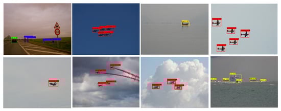 We randomly pick nine images from the test sets that have the smallest object tags for visualization in order to further validate the performance of the proposed algorithm (Figure 12). The chosen sample images are typical image samples with a large number of image samples or a high ratio of small objects to overall object labels. In order to visually view the detection effect, the size of the object anchor in each sample image is counted and marked on the right side of the image. We find that although the proposed algorithm makes difficult judgments on some small objects (the confidence level was close to 0.5), the overall judgment is accurate, and the proposed algorithm improves the detection performance of small objects.