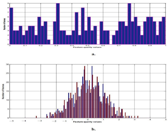 Feature distribution Feature distribution for two dissimilar videos (a,b) where some value reaches to zero where as some feature attain value close to one which means high fidelity frame have maximum score where as poor frames have minimum score. Here, x−axis represents feature quality values and y−axis represents number of frames.