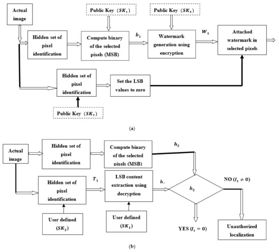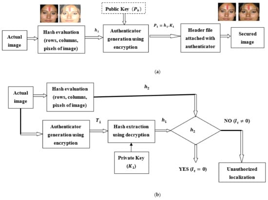 Authentication means verifying real value or content which is achieved without being tempered. As, in real-time applications, it is very difficult to maintain its original identity because of the number of reasons being generated by surrounding or by the communication devices. Image authentication does not accept any tempered image data. The conventional approach constructed on coding evaluates content evidence from portrayal utilizing a function called ‘hash’ [21,22]. This hash function is altered and coded using an exclusive key for the transmitter and then connected to the portrayal. So, for higher security data interchange between matters, the function hash can code taking support of the public key of the beneficiary [23]. The authentication and verification are depicted in Figure 5a,b.