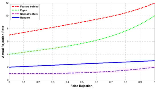 The incorrect receiving and incorrect refusal cost is high for feature trained portrayal compared to Eigen, random and normal feature images and for security point of view it must too low to achieve desirable high verification performance. But the false acceptance rate is high of feature trained image which is a good symbol of achieving high verification rate and it helps in maintaining the security measures in real time image like video surveillance, authentication etc. depicted in Figure 8 and Figure 9. The actual acceptance can be normalized by decreasing the false acceptance rate or false rejection rate and if it increased it will linearly grow as shown in Figure 8 and Figure 9 below.