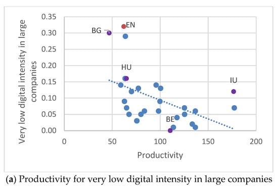 The higher the percentage of small and medium-sized companies that use a very large number of digital technologies, the higher the level of productivity (Figure 2). At the same time, the higher the percentage of SMEs that use a very small number of digital technologies, the lower the level of productivity. Basically, the positive correlation between digital integration and productivity is maintained when we strictly analyze small and medium-sized companies, with at least 10 employees. The degree of dispersion is slightly higher in the case of very high digital intensity, in relation to productivity. Large companies (Figure 3) indicate a similar relationship, with a clear trend of associating productivity with the intensity of digitalization of companies. In this case, however, a group of three countries (Romania, Bulgaria, and Greece) does not follow the trend in the region, having a very low level of productivity and standing out through the high percentage of large companies with a low degree of digitalization intensity.