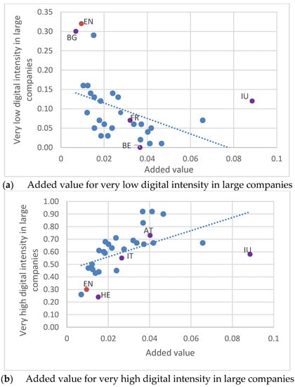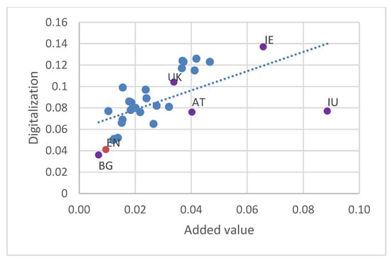 Value-added data were obtained from Eurostat, which provides, on the one hand, Member States’ data on gross value added and, on the other hand, data on population, to be able to calculate the value added per capita, so that population differences between EU states should not affect the results obtained. Gross value added (GVA) is expressed in millions of euros and is calculated by the difference between the value of the goods and services produced and intermediate consumption. Figure 4, Figure 5 and Figure 6 graphically show the relationship between per capita GVA and digitization in the Member States of the European Union [17].