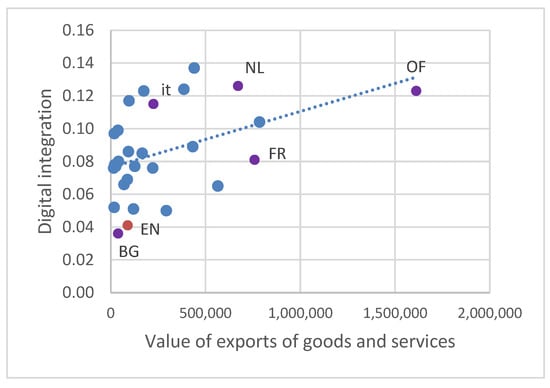 When we compare the value of exports with the level of digital integration, we have a high degree of dispersion, but also a clear trend, which suggests a positive correlation between the two variables.