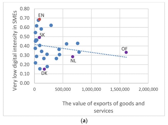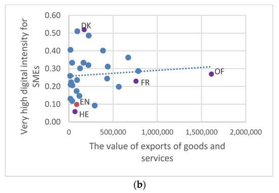 The relationship between digital intensity for SMEs and EU exports in 2019. (a) The value of exports of goods and services for very low digital intensity in SMEs. (b) The value of exports of goods and services for very high digital intensity in SMEs.
