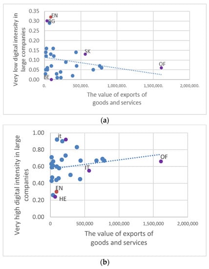 The relationship between digital intensity in large companies and exports to the EU in 2019. (a) The value of exports of goods and services for very low digital intensity in large companies. (b) The value of exports of goods and services for very high digital intensity in large companies.