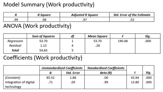 Using these methods, a high correlation has been achieved between digitalization and labor productivity in the case of the European Union and, moreover, a high impact of the integration of digital technology on labor productivity. The coefficient of determination for regression R2 (which is, in fact, identical to the coefficient of determination for correlation), is 0.98, which means that 98% of labor productivity in the European Union between 2014 and 2019 can be explained by integration of digital technologies—the correction of R2 slightly decreases this percentage, up to 97%.