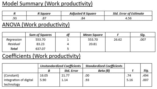 In the table related to the coefficients, there is the information necessary to predict labor productivity according to digitalization, but also the degree to which digitization contributes to the model. This results in the following regression equation for predicting digitalized labor productivity in the European Union: