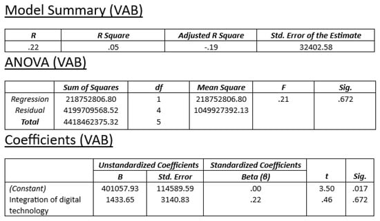 In the case of the effect of integrating digital technologies on gross value added, different results have been obtained. Even though the scatter plot seemed to suggest a strong relationship between the two variables in the case of the European Union (Figure 12), the significance coefficient is very high (0.672), indicating a statistically insignificant relationship between digitization and gross value added. in the European Union. In fact, the correlation coefficient is also low (0.05), and, after correcting it, it becomes a negative one (−0.19).