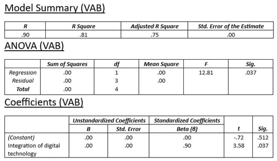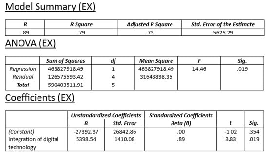 The simple linear regression in the case of the effect of digitization and exports to the European Union obtained a coefficient of determination for regression of 0.71 and, adjusted, 0.64. Therefore, 64% of EU exports could be explained by the integration of digital technologies; the test has statistical significance, being below the threshold of 0.05, with the value of 0.035, but we emphasize its positioning towards the upper limit of the range of statistical significance (Figure 14). Given the values in the table for coefficients, we obtain this regression equation: