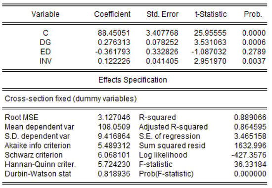 The least squares method is a common way to perform a multiple regression analysis (Figure 16); In the case of the linear one, the objective is that the points related to the variables match a line, the best matching line being the one in which the deviations are minimal. The purpose of performing the regression analysis is to answer the question of whether the selected variables have an impact on the dependent variable, especially if it is a positive one. In EViews, the test selected was Least Panels Squares, with standard cross-section weights (PCSE) options errors & covariance.
