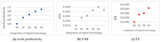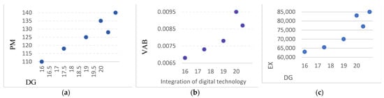 A good distribution for this purpose is both the gross value added and the exports, indicating that in all three cases, linear regression can be used. This visual representation suggests a possible positive correlation between digitalization and the three dependent variables (Scheme 2a–c).