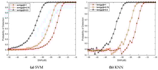 This paper first discusses the shape parameters in noise models Value selection, using geometric power as a feature, and using SVM and KNN for simulation experiments; the results are shown in Figure 1a,b. Among them, Figure 1a is the resulting graph from using SVM, and Figure 1b is the resulting graph from using KNN.