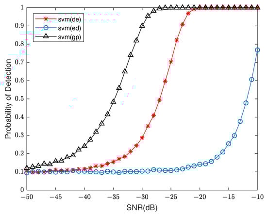 As can be seen from Figure 2, when the SNR is lower than −25 dB, the detection probability of the SVM spectrum sensing method based on GP features is much higher than that of the SVM spectrum sensing method based on ES features and DE features, and the SVM spectrum sensing method based on GP features can achieve a detection rate close to 1 when the SNR is −27 dB.