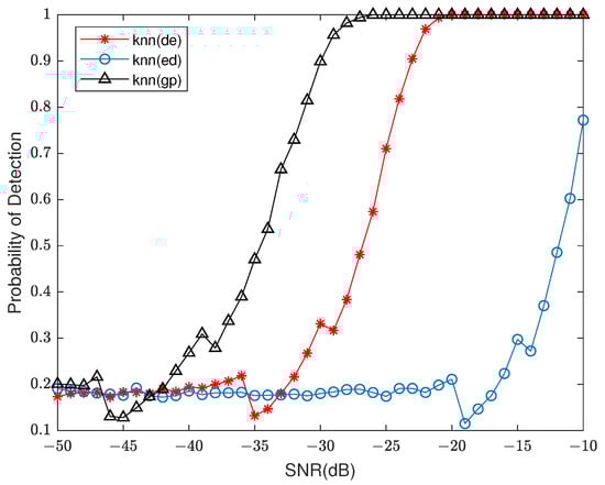 As can be seen from Figure 3, when the SNR is lower than −23 dB, the detection probability of the KNN spectrum sensing method based on GP features is much higher than that of the KNN spectrum sensing method based on ES features and DE features, and the KNN spectrum sensing method based on GP features can achieve a detection rate close to 1 when the SNR is −27 dB.