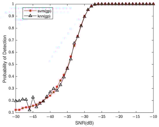 Since the AuC of SVM and KNN spectrum sensing methods based on GP and DE are both 1, this paper also considers these three features under low SNR, and the results are shown in Figure 2, Figure 3 and Figure 4.