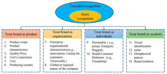For the definition of ontology, we choose David A. Aaker’s brand theory, which is widely followed by communication and marketing, as the domain knowledge framework. Aaker is praised by Brand Weekly as the “Ancestor of Brand Equity” [14]; he put forward the “brand identity system” in his book “Building Strong Brands” [4], as shown in Figure 3.