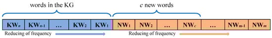 Our Apriori takes the words in the Data Resource part as the candidate data. First, there is a synonym replacement according to the Synonym KGs in the Knowledge Integrator part, which can make the frequency of words more concentrated. Secondly, count the frequency of each word. Thirdly, construct the word frequency vector as shown in Figure 6. There are two parts in the vector, the KG words part (KWn) and the new words part (NWm). The words in each part are sorted separately based on their frequencies.